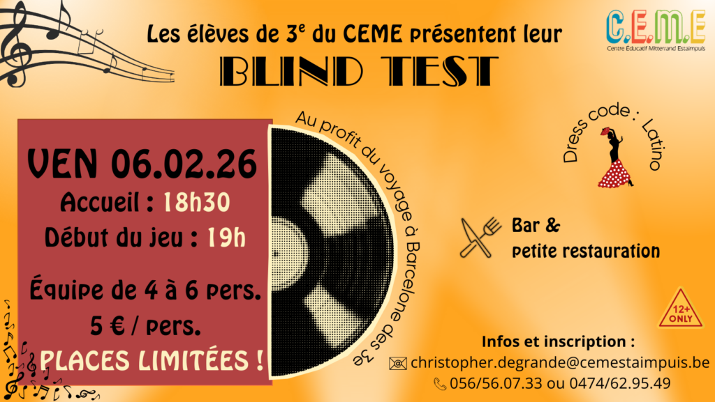 Les élèves de 3ème du CEME ont le plaisir de vous inviter à leur Blind TEST le vendredi 06/02/2025 à partir de 18h30.